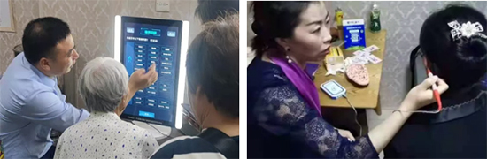 11日,在昆山新时优品健康管理服务中心,分公司培训师与当地新时代人一起,运用智能健康镜、扶阳罐、耳穴仪等健康服务设备,为社区居民提供健康监测服务,进行健康知识科普。