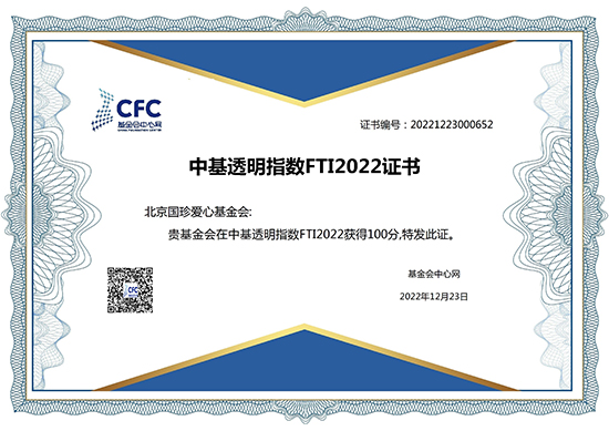 近日,在北京市民政局发布的2022年度社会组织等级评估中,北京国珍爱心基金会荣获AAA级社会组织评估等级,并在基金会中心网发布的中基透明指数FTI2022中,获得透明度满分100分殊荣。