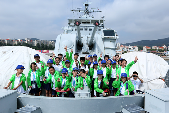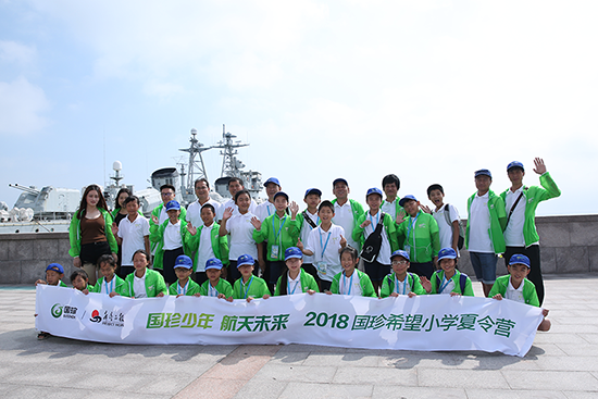 ▲ 国珍希望小学夏令营的师生们抵达合肥号导弹驱逐舰