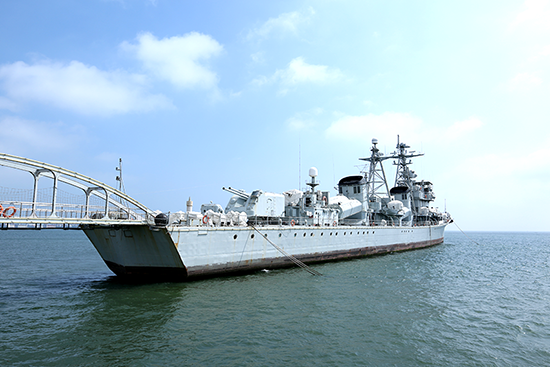 金色的阳光均匀镀在了海平面上,我国第一艘自主研发的导弹驱逐舰 ,在粼粼的波光中傲视着海岸线,仿佛黄海明珠旁警觉伫立的海洋卫士。