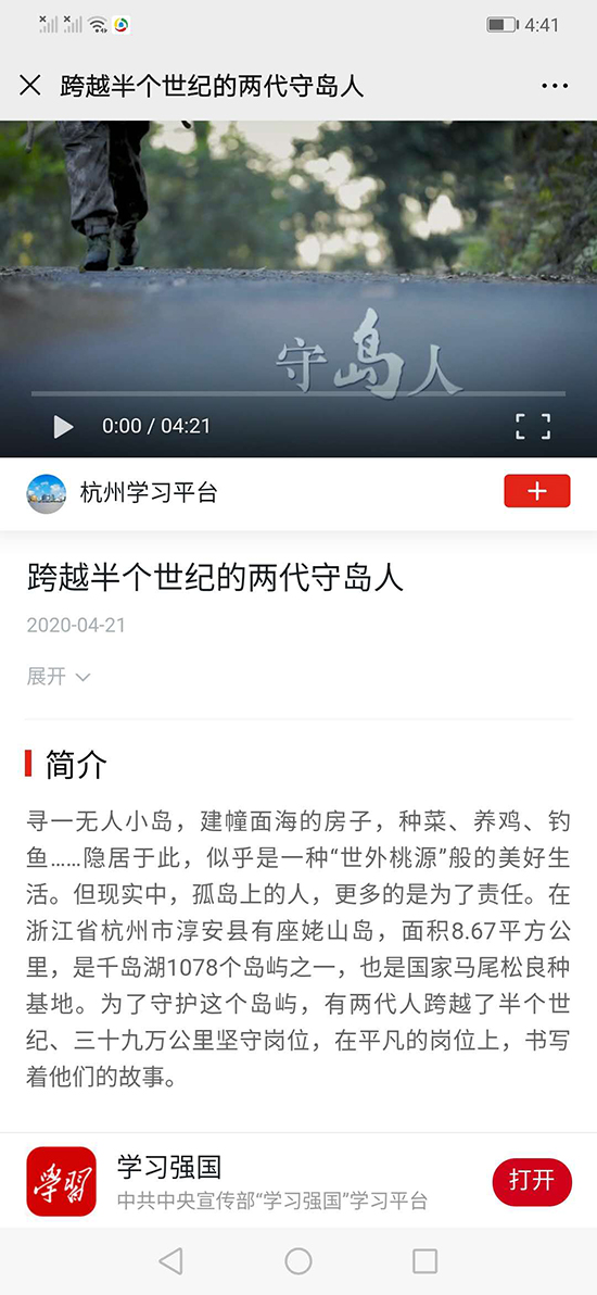 4月21日,由中国节能下属企业新时代健康产业集团摄制的《跨越半个世纪的两代守岛人》宣传片登录“学习强国”平台。