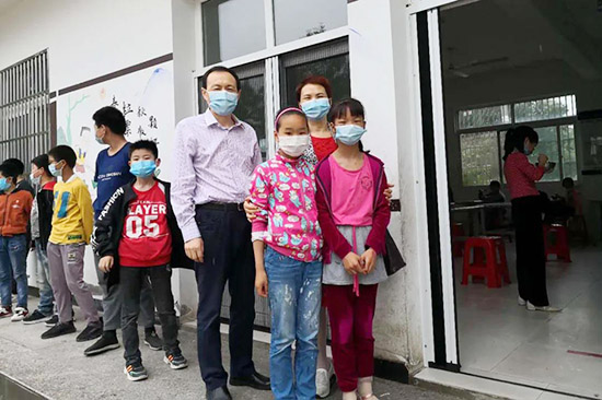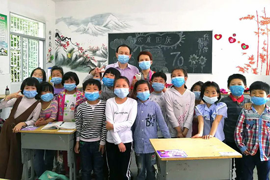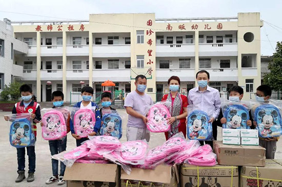5月29日,安徽金寨县国珍希望小学复课后,荣誉校长王梅、王颍伉俪来到学校看望孩子和老师们。为给孩子创造健康安全的学习环境,他们带来了2000只口罩,数百份书包、文具作为特殊时期的“六一”儿童节礼物。