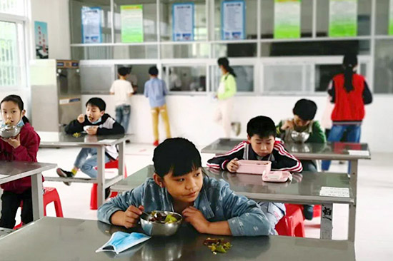 为了解孩子们的就餐环境,王梅伉俪夫妇来到食堂,与孩子们一同排队,在学校食堂就餐,切身了解孩子们的饮食状况。