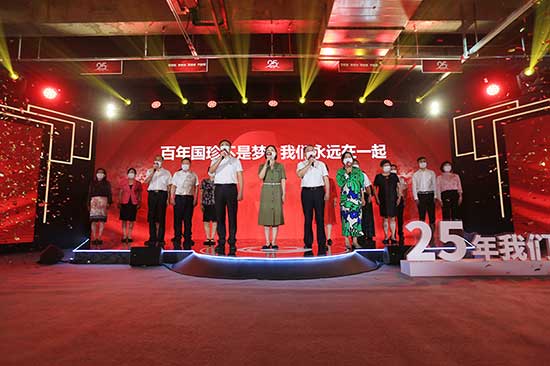 给力举措重磅发布,真情朗诵诉说情怀。带着25年快速发展的自豪,带着决胜未来的信心,现场公司领导、国珍市场发展咨询委员会代表们走上舞台,深情朗诵25周年庆典诗歌——《同心共筑国珍梦 奋力开创新时代》。昂扬澎湃的诗词,抑扬顿挫的朗诵,铿锵有力的声音,传递着大家对新时代25年拼搏岁月的怀念与敬意,抒发新时代人青春不散场、创造新辉煌、永远在一起的信念与决心。