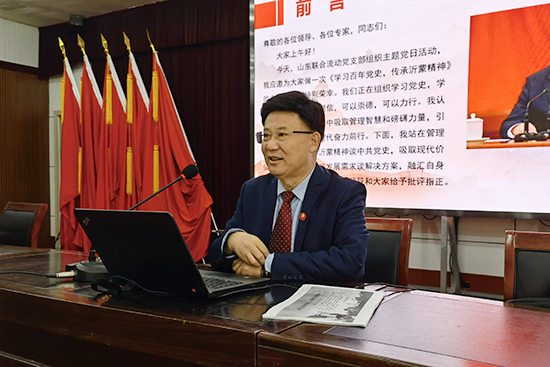 临沂大学传媒学院教授、临沂创业大学副校长、红色沂蒙教育发展中心主任李日升为现场党员与市场骨干上了一堂生动的党课。他希望大家通过党史教育学习坚定理想信念,做到学史明理、学史增信、学史崇德、学史力行。