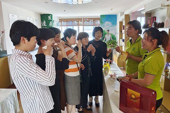 活动开始,国珍健康生活馆志愿者为到场的妈妈们献上专属鲜花,并为她们合影留念。随后,志愿者们运用皮肤分析仪、扶阳罐等设备为大家提供健康监测服务,并带领大家体验了兰萃系列、苏芙气垫等新产品。