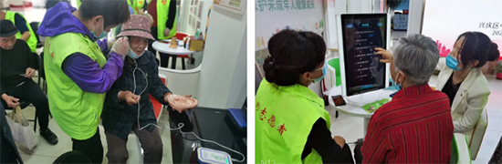 国珍健康生活馆志愿者带领社区居民体验了健康服务设备,并给予相应的健康指导。智能健康镜、耳穴仪、扶阳罐等健康设备纷纷受到大家的好评。